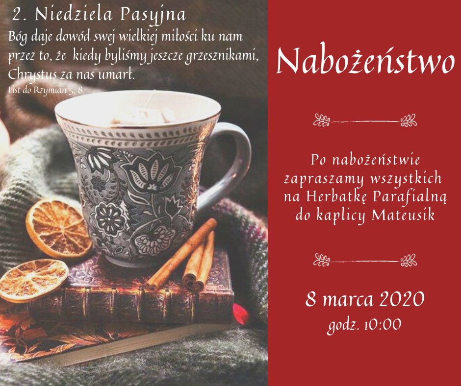 HERBATKA PARAFIALNA Zapraszamy na nabożeństwo w niedzielę, 8 marca o godz. 10:00. Równolegle z nabożeństwem odbywać się będzie szkółka niedzielna dla dzieci. Po nabożeństwie zapraszamy wszystkich na “Herbatkę Parafialną” do Kaplicy Mateusik. Pliki do pobrania fb- herbatka
