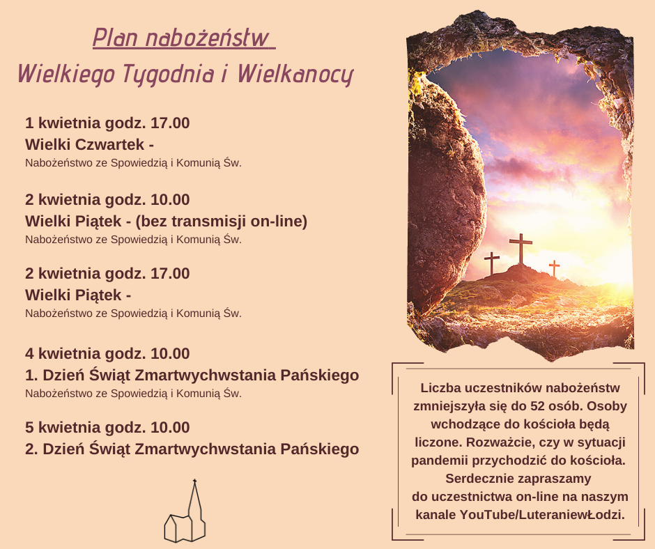 Liczba uczestników nabożeństw zmniejszyła się do 52 osób. Osoby wchodzące do kościoła będą liczone. Rozważcie, czy w sytuacji pandemii przychodzić do kościoła. Serdecznie zapraszamy do uczestnictwa on-line na naszym kanale YouTube/LuteraniewŁodzi