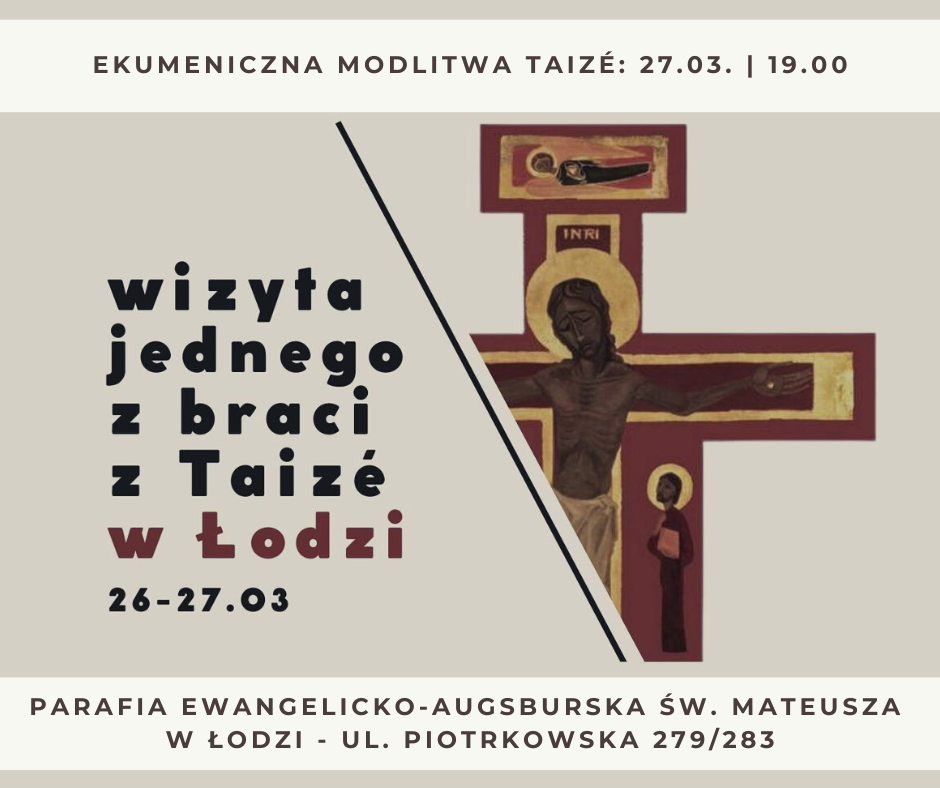 EKUMENICZNA MODLITWA TAIZÉ, 27.03.2023 Zapraszamy na Ekumeniczną Modlitwę Taizé w najbliższy poniedziałek, 27 marca o godz. 19.00 w Kaplicy “Mateusik” (wejście bramą od ul. Czerwonej). Pliki do pobrania EKUMENICZNA Modlitwa TAIZÉ