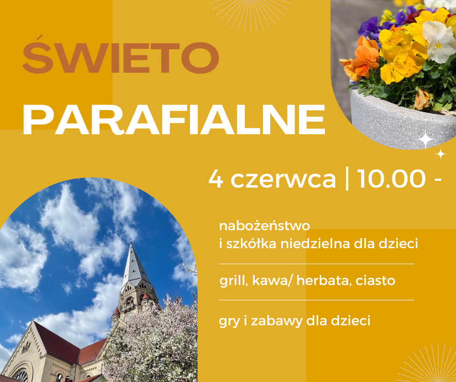 ŚWIĘTO PARAFIALNE, 04.06.2023 Zapraszamy na nabożeństwo ze Spowiedzią i Komunią Św., 4 czerwca, godz. 10.00. Podczas nabożeństwa odbędzie się szkółka niedzielna dla dzieci. Po nabożeństwie zapraszamy do ogrodu na Święto Parafialne!!! Pliki do pobrania świeto 04.06.