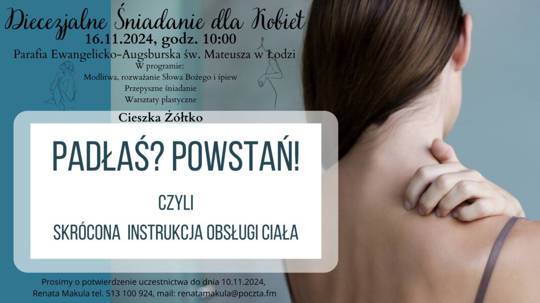 Zapraszamy wszystkie kobiety z naszej diecezji na wyjątkowe spotkanie dla ciała i ducha. W sobotę, 16. listopada będziemy Was gościć zapewniając doskonałą atmosferę do modlitwy, rozważań Słowa Bożego i śpiewu ku chwale Najwyższego. Zachęcamy gorąco do udziału w warsztatach plastycznych, jak i w warsztacie z ciałem prowadzonym przez Cieszkę Żółtko.  Na stołach nie zabraknie smakołyków, zarówno na słodko, jak i na wytrawnie. Prosimy o potwierdzenie uczestnictwa do dnia 10.11.2024 na adres: renatamakula@poczta.fm lub telefonicznie 513 100 924.