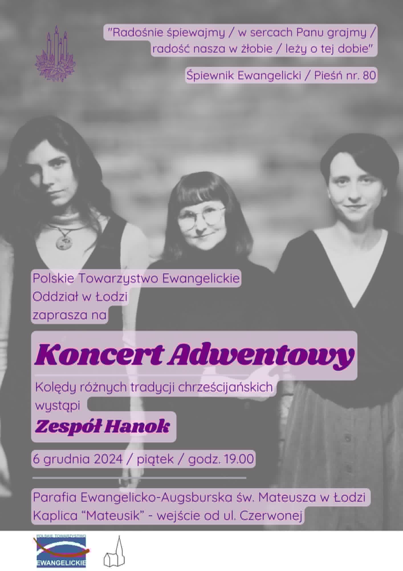 Polskie Towarzystwo Ewangelickie, Oddział w Łodzi, zaprasza na KONCERT ADWENTOWY zespołu HANOK.