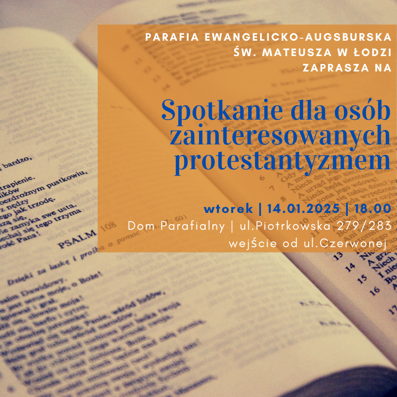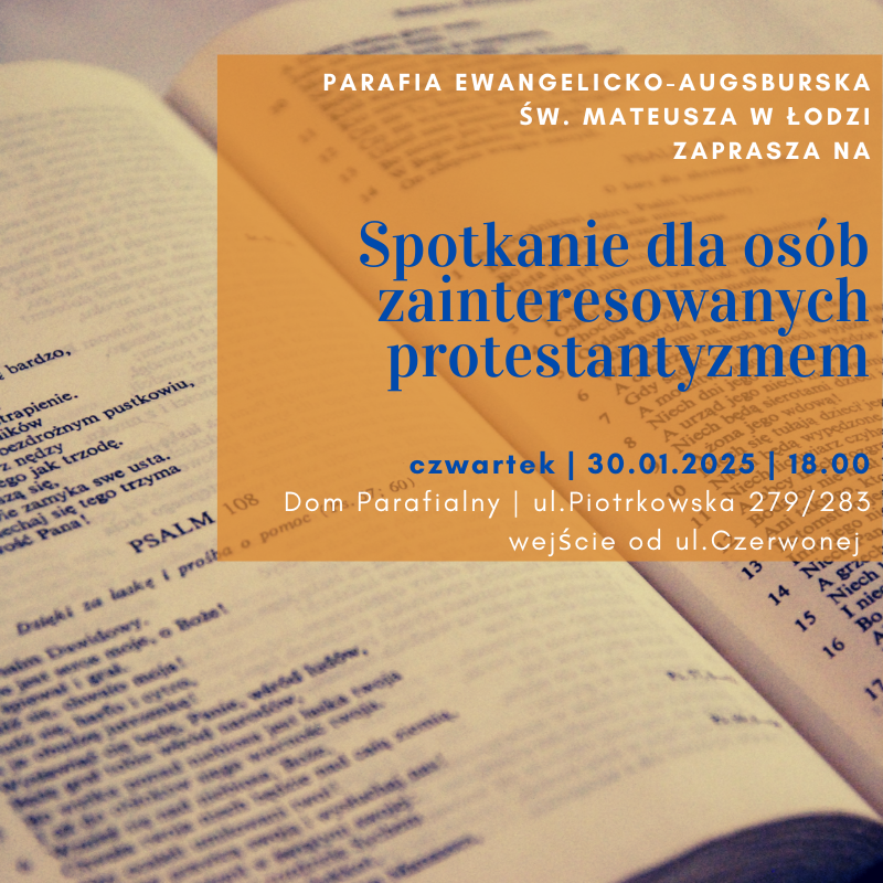 SPOTKANIE DLA ZAINTERESOWANYCH PROTESTANTYZMEMZapraszamy na pierwsze w Nowym Roku spotkanie dla osób zainteresowanych protestantyzmem, które odbędzie się w czwartek 30. stycznia o godz. 18:00 w Domu Parafialnym – wejście od ulicy Czerwonej. Pliki do pobrania Spotkanie dla zainteresowanych 01.2025 Spotkanie dla zainteresowanych 01.2025 (1)