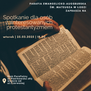 SPOTKANIE DLA ZAINTERESOWANYCH PROTESTANTYZMEM25. marca o godz. 18:00 w Domu Parafialnym – wejście od ulicy Czerwonej, odbędzie się spotkanie dla osób zainteresowanych protestantyzmem. Zapraszamy! Pliki do pobrania Spotkanie dla zainteresowanych 03.2025 (2)