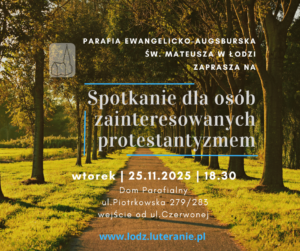 SPOTKANIE DLA ZAINTERESOWANYCH PROTESTANTYZMEM Pliki do pobrania wtorek 25.11.2025 18.30 Dom Parafialny ul.Piotrkowska 279283 wejście od ul.Czerwonej